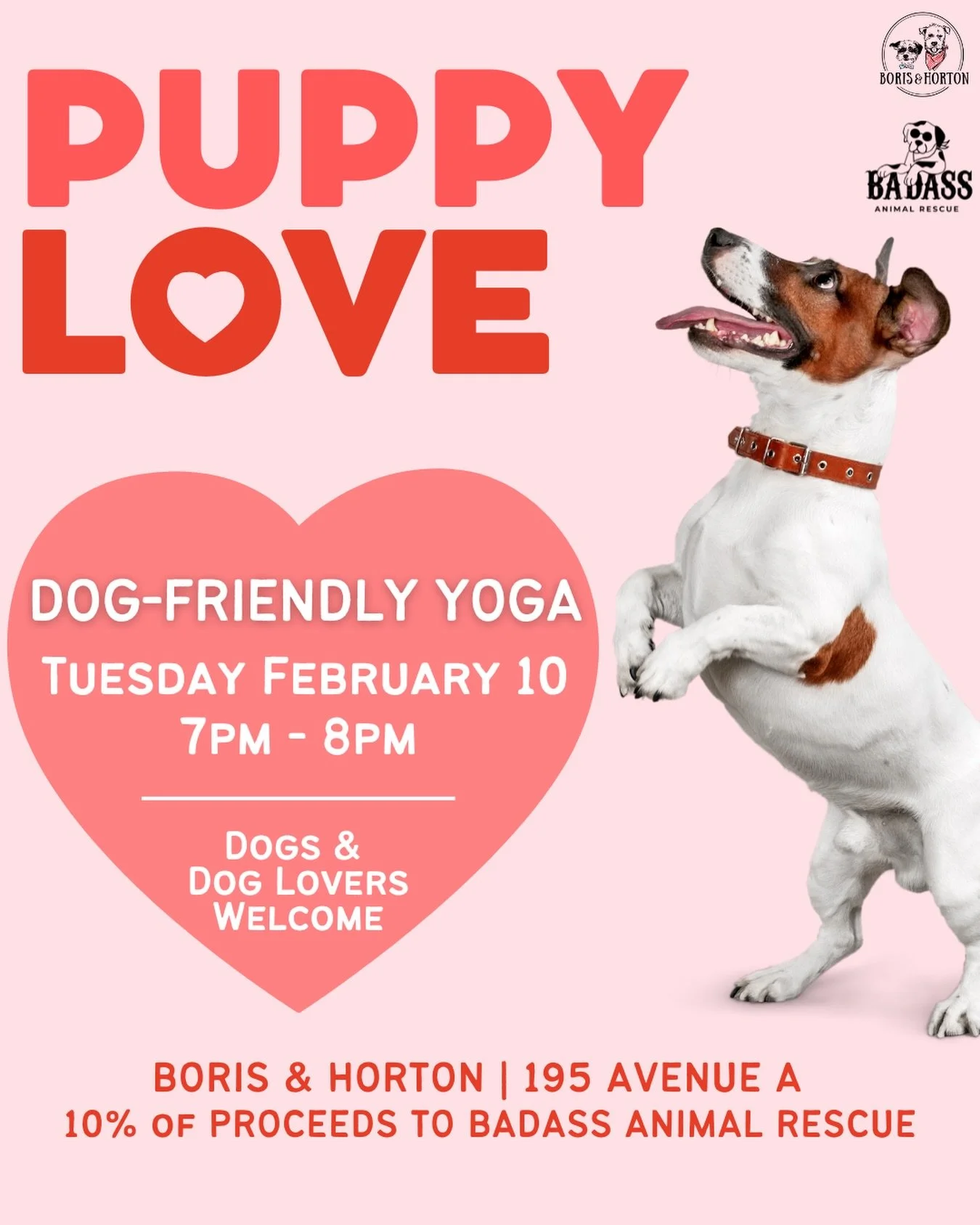 Back to All Events Puppy Love Dog Friendly Yoga @ Boris & Horton (East Village) Tuesday, February 10, 2026 7:00 PM 8:00 PM Google Calendar ICS